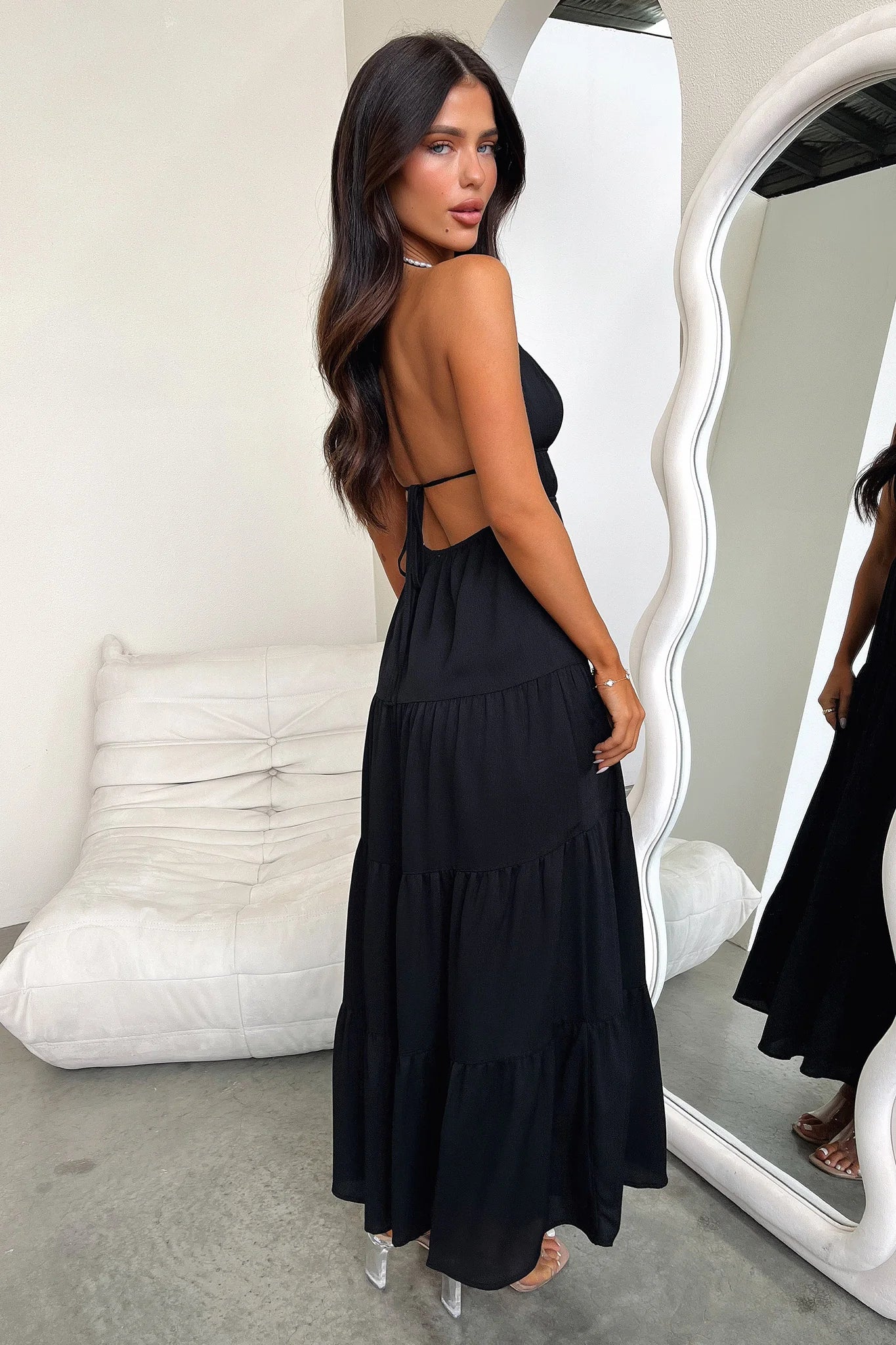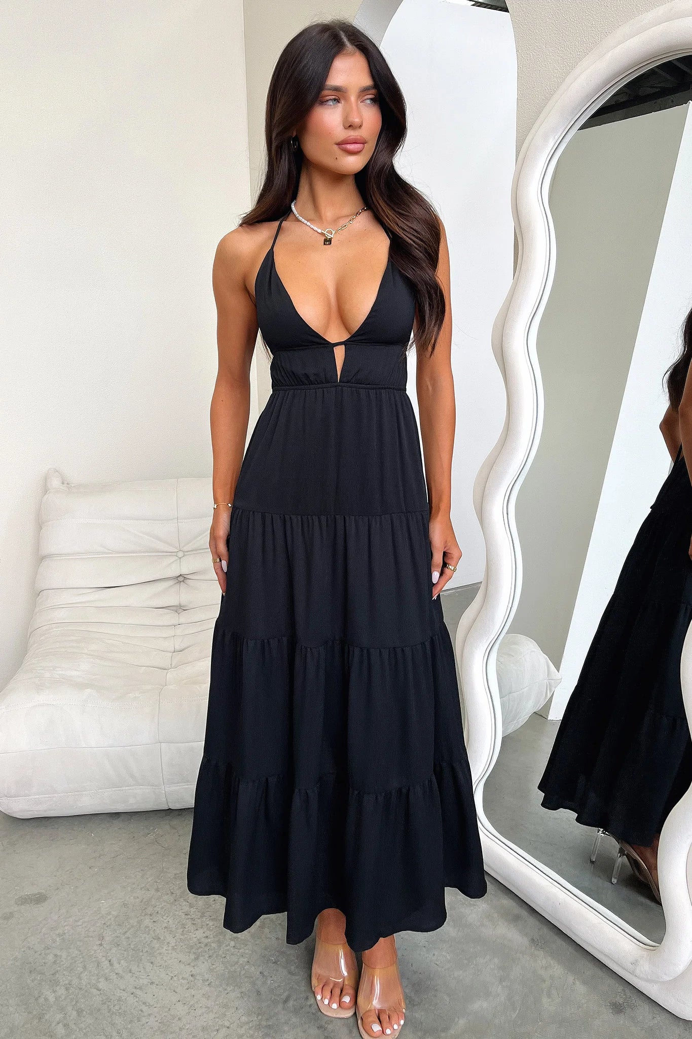 This must have summer maxi is a need, not a want! Featuring a V-neckline with halter straps, a maxi, flowy skirt, double lining, and an elasticated and open back. Wear this hunny paired with black sandals and gold jewellery.