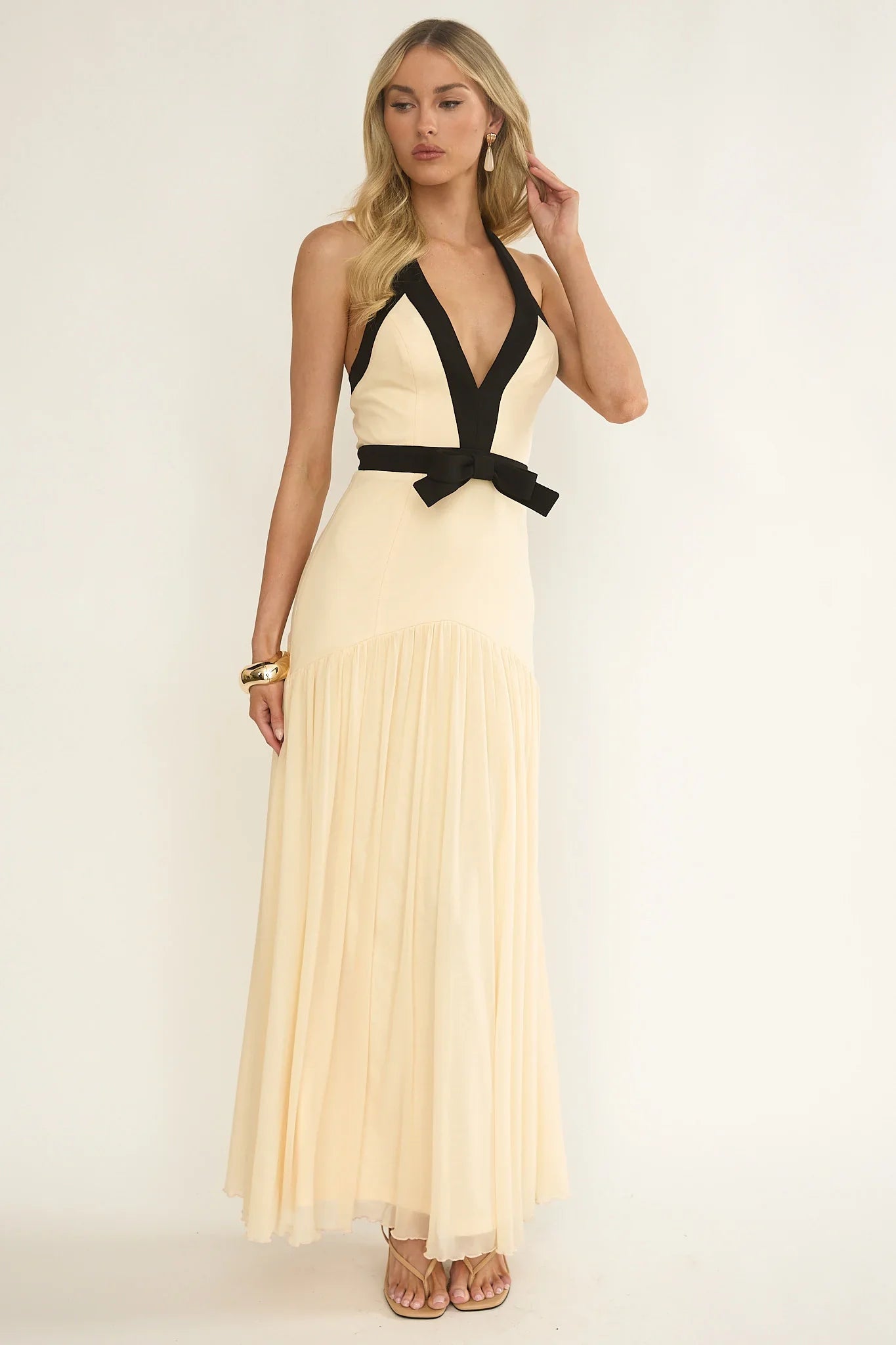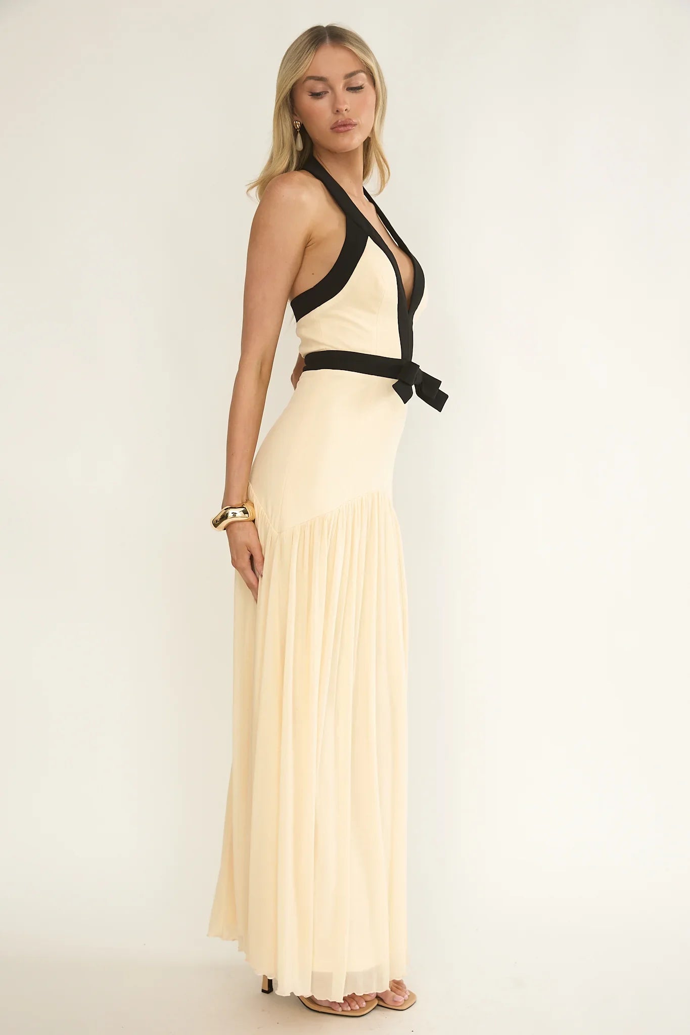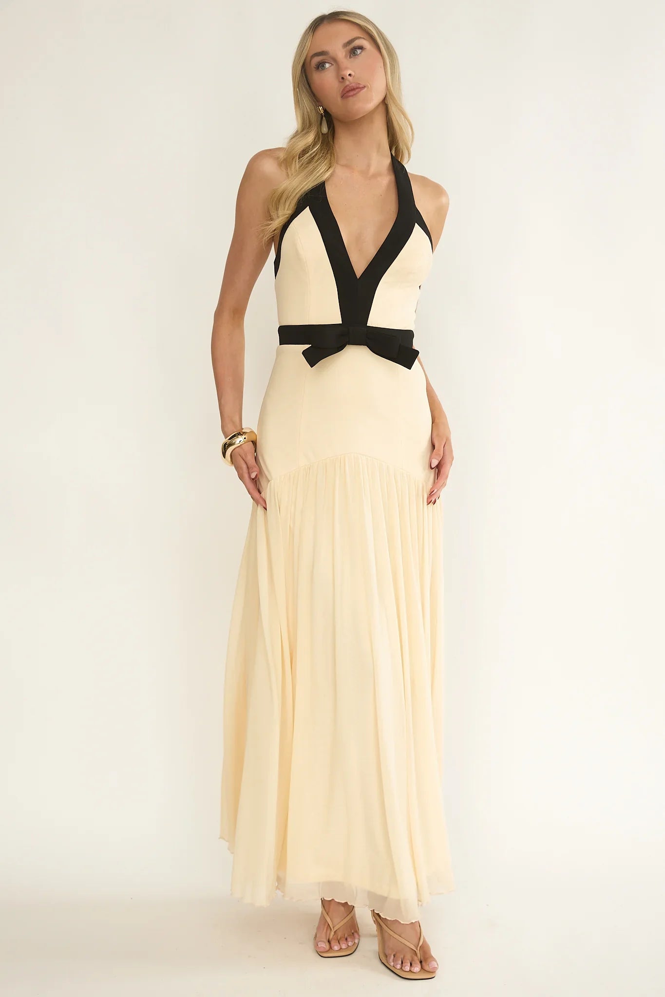 Channel iconic glamour in our elegant Aven maxi dress. It features a beautiful halter neckline with a deep V-neck trimmed in contrasting black piping, and a gorgeous bow accent. Perfect for a formal wedding, chic cocktail party, or a glamorous evening out. Team it with gold accessories and a slick bun for a sophisticated, timeless look.