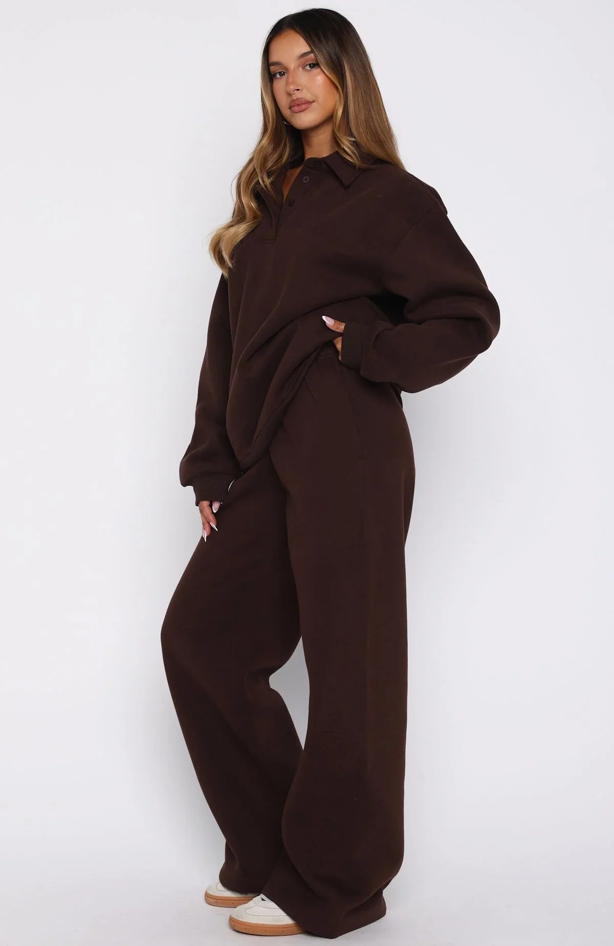 The Stay Lifted Wide Leg Sweatpants in Chocolate combine comfort and style effortlessly. Crafted from a soft fleece interior, these sweatpants feature an elasticated waistband with an internal drawstring, wide-leg silhouette, oversized fit, and side hip pockets. The embossed White Fox logo along the pant side adds subtle flair. Style with the matching Chill Moves Oversized Henley Sweater Chocolate.