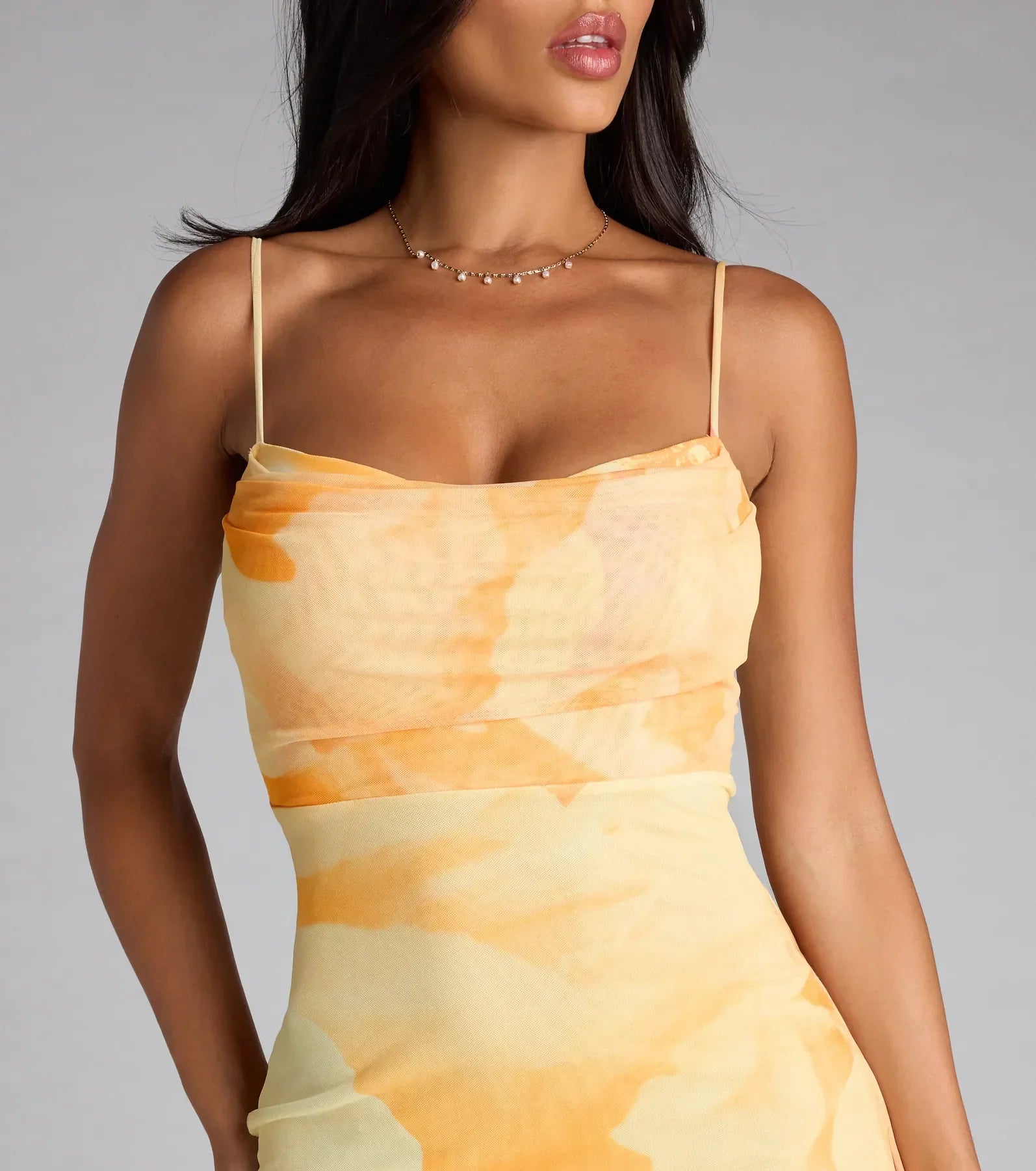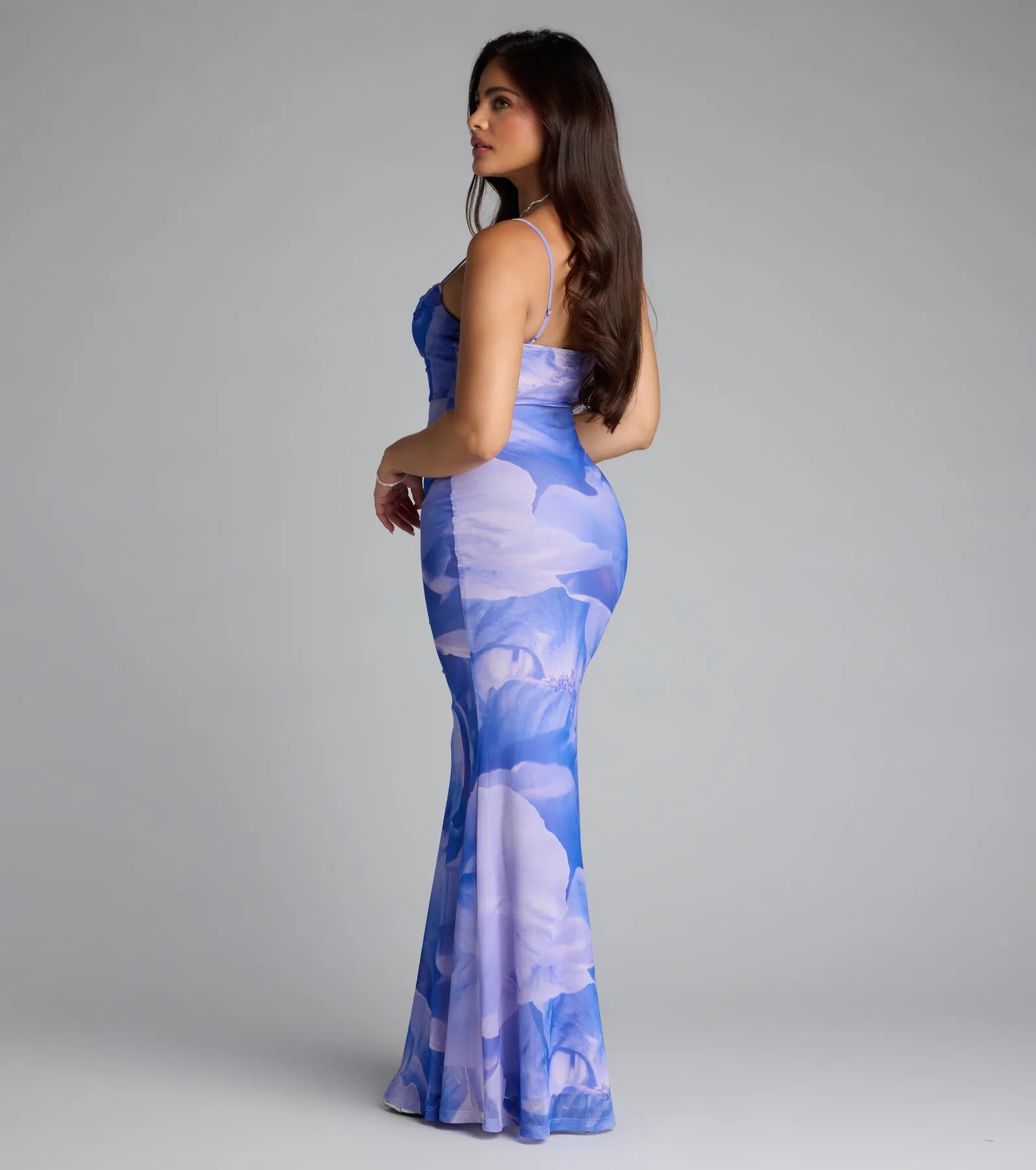 This floral maxi dress is soft, stunning, and just a little mysterious. The dreamy drape and floral mesh give off major “walking through a field of wildflowers” energy.