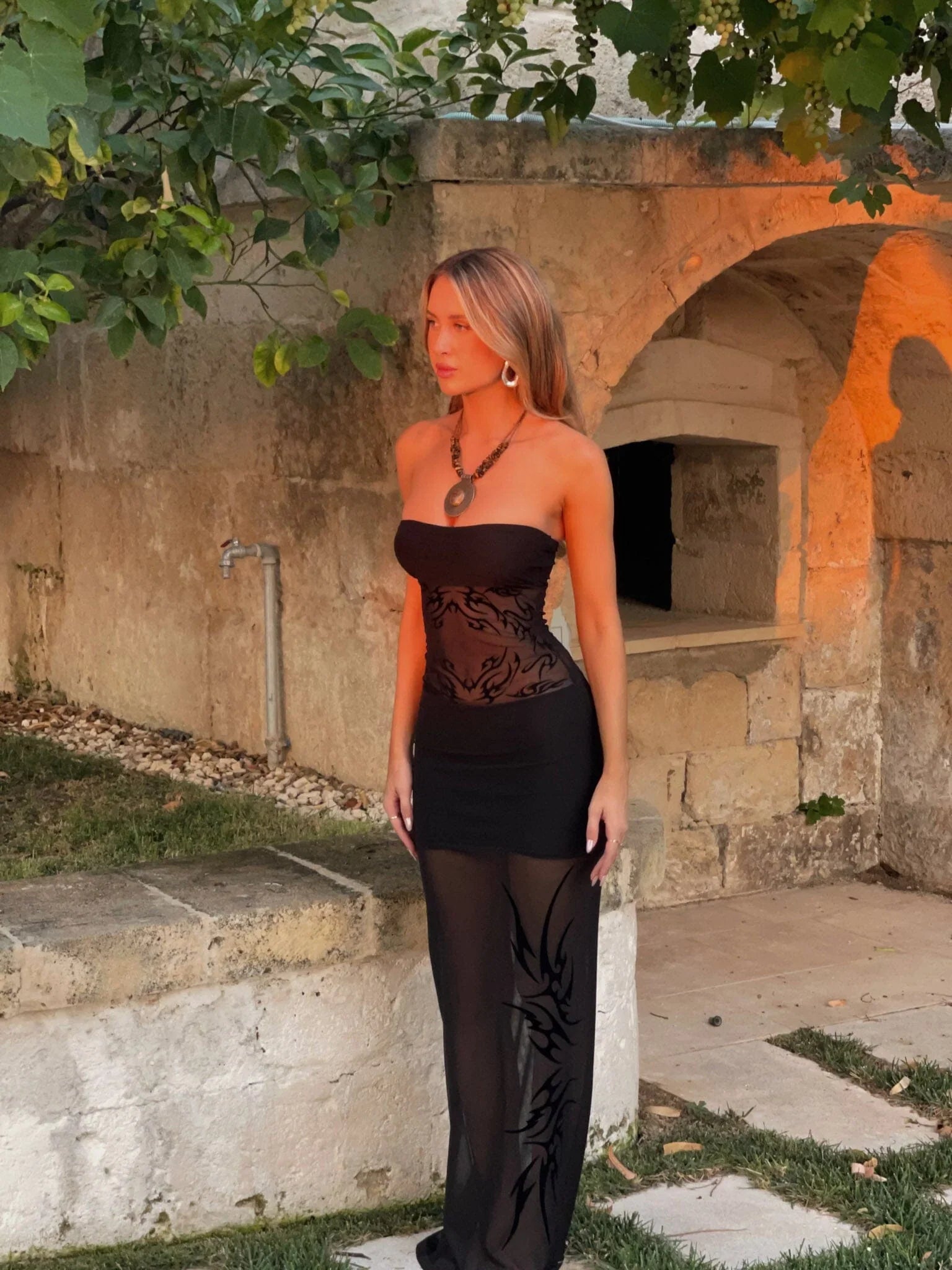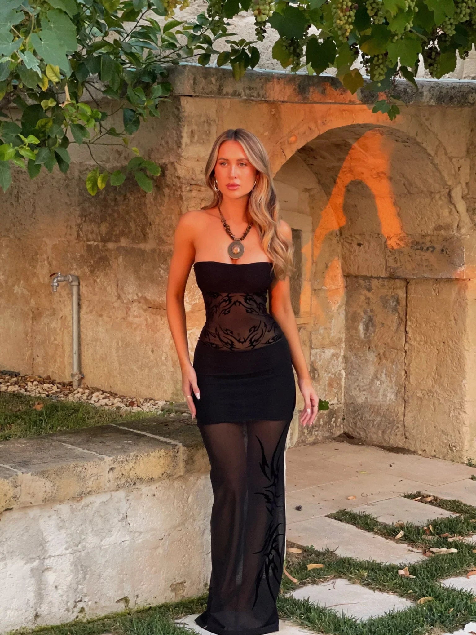 Cut from a sheer mesh fabrication with mesh lining at the bust and skirt! Edie features a strapless neckline to showcase your décolletage and a body-con fit to flatter your figure. Edie is detailed with a printed design crafted from our Outcast exclusive burnout mesh fabrication to add further intricacy to the design!
