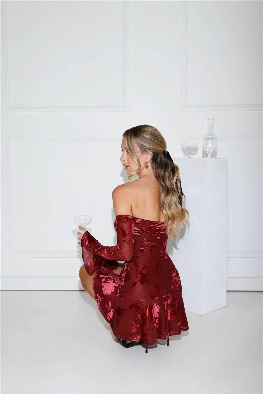 Turn up the luxe in the Electric Envy Off Shoulder Mini Dress. Featuring stretchy fabric with a velvet-like print, long sleeves, and a sultry off-the-shoulder neckline. This mini is made for stealing the spotlight. Style with heels.