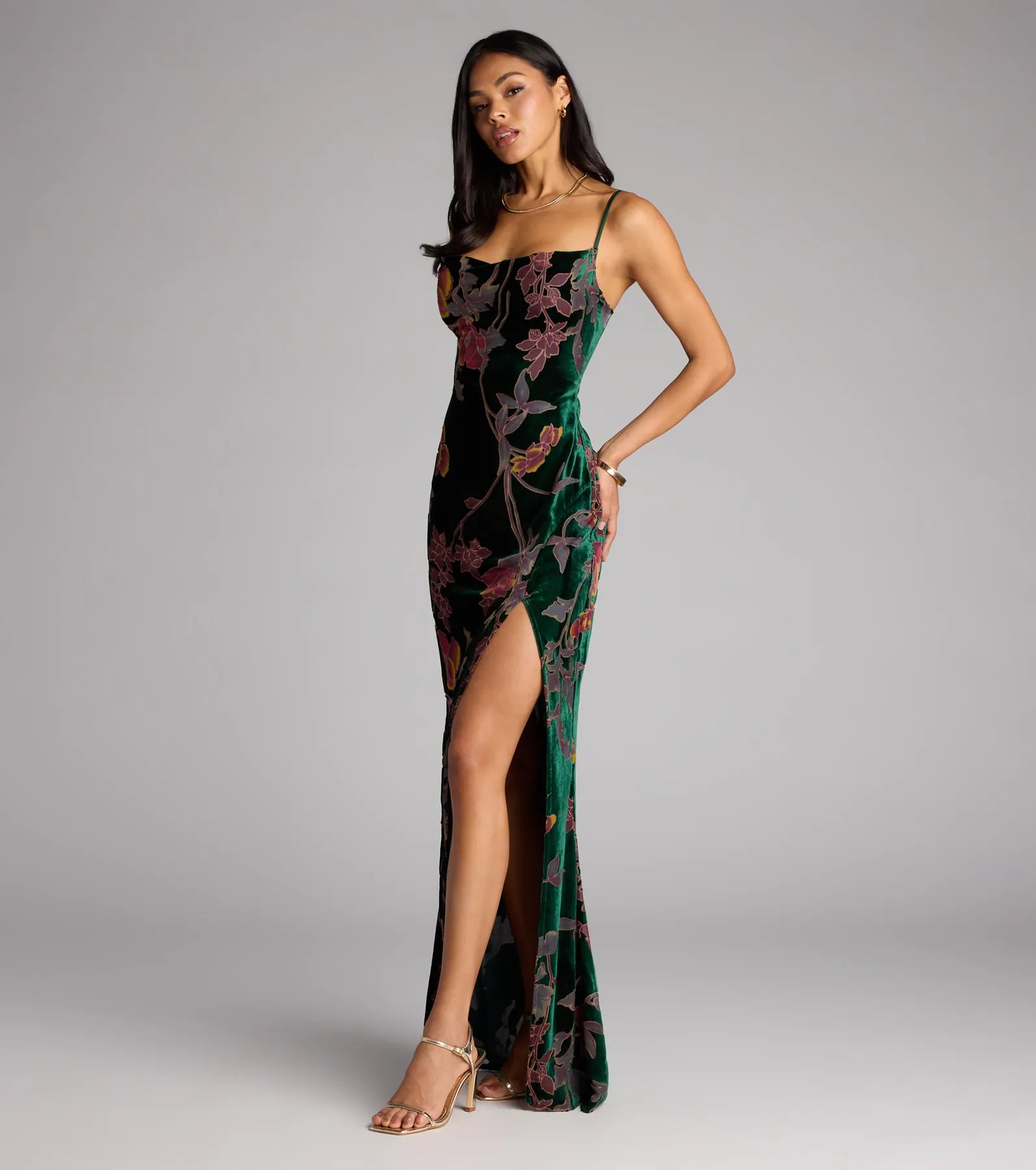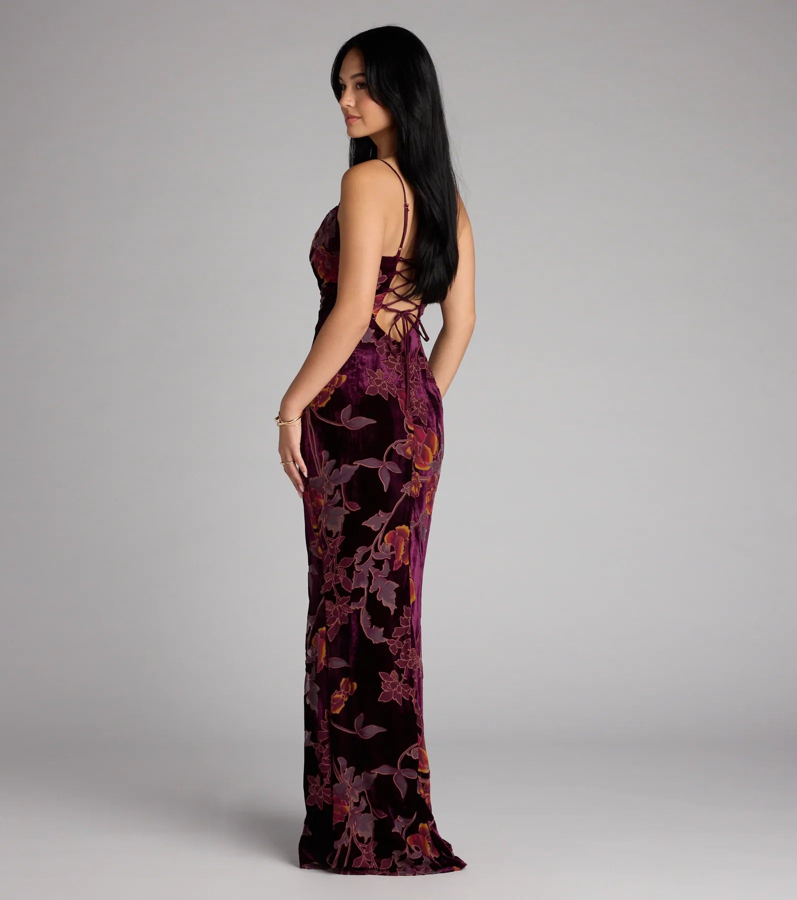 Meet the dress that owns the room—the Melanie stuns in plush velvet with a flocked floral pattern, a curve-hugging silhouette, and a lace-up back made for your next big entrance.